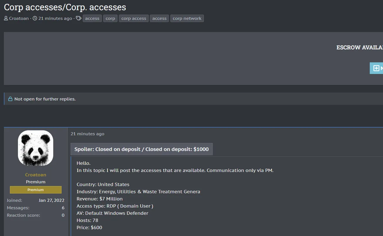 A Threat Actor is Allegedly Selling RDP Access to an Unidentified Company in the USA