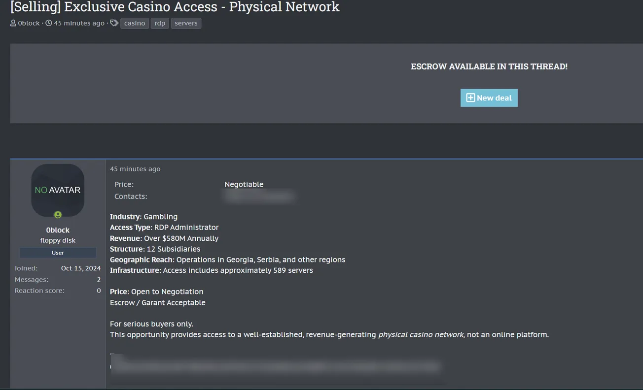 A Threat Actor is Allegedly Selling RDP Access to an Unidentified Gambling Company