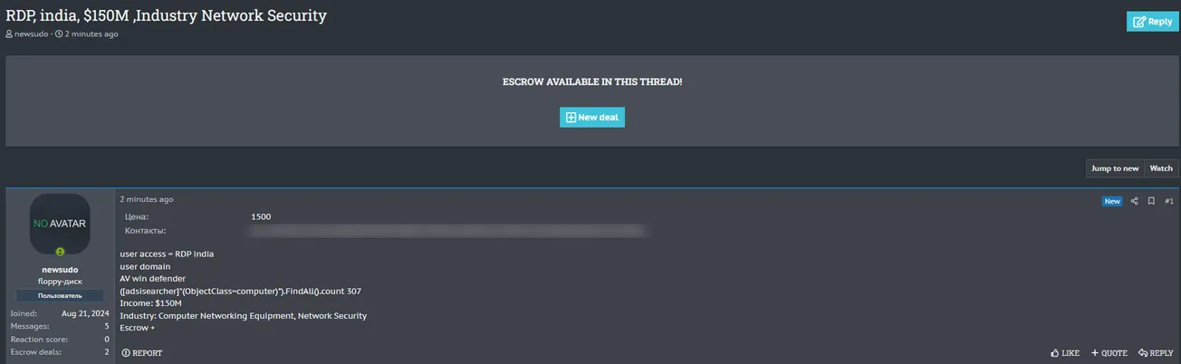 A Threat Actor is Allegedly Selling RDP Access to an Unidentified Indian Company