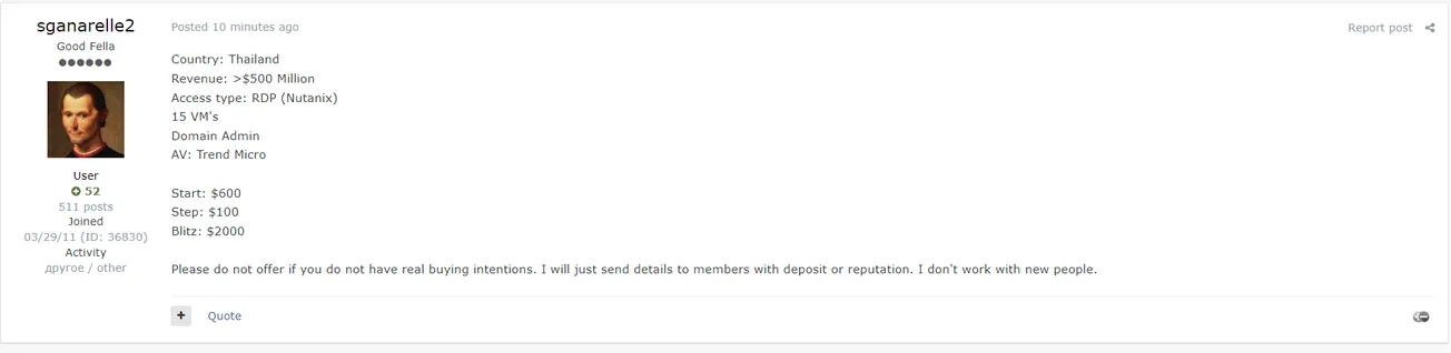 A Threat Actor is Allegedly Selling RDP Access to an Unidentified Thailand-based Company