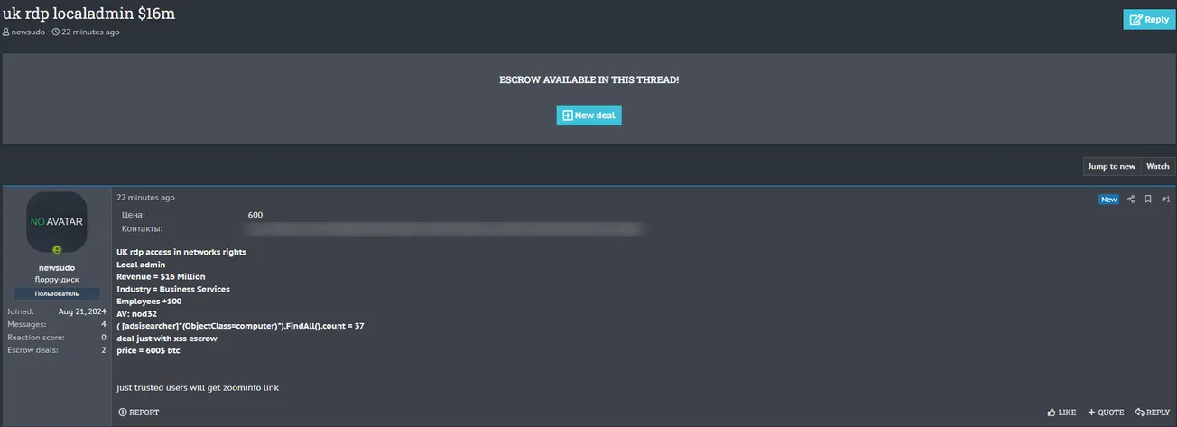 A Threat Actor is Allegedly Selling RDP Access to an Unidentified UK Company