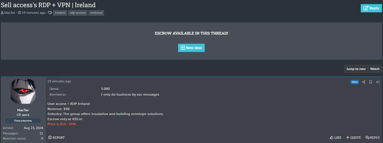🚨 Title: Alleged sale of RDP and VPN access to an unidentified Irish company