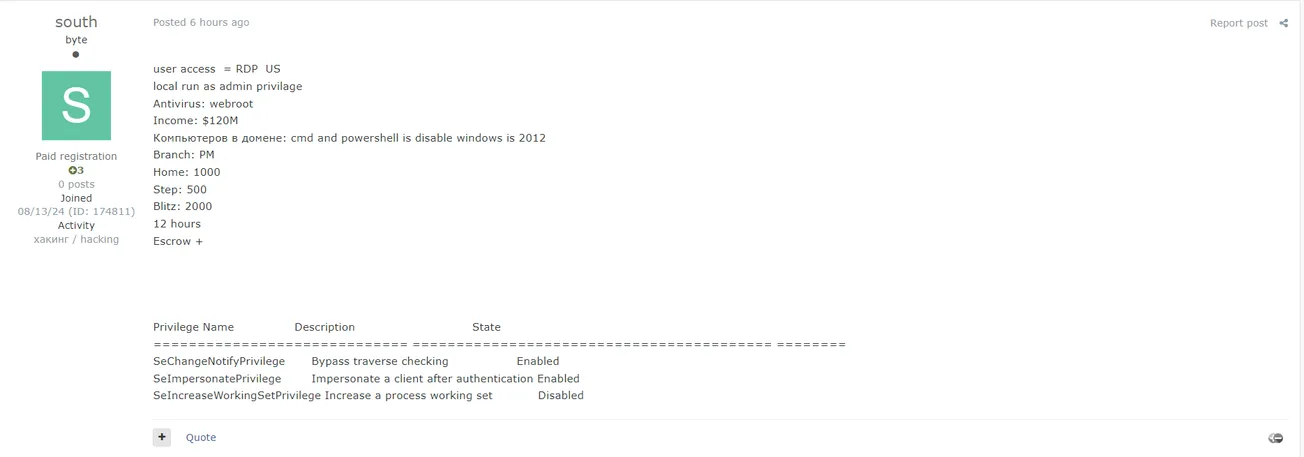 A Threat Actor is Allegedly Selling RDP Sccess to an Unidentified U.S.-based Company