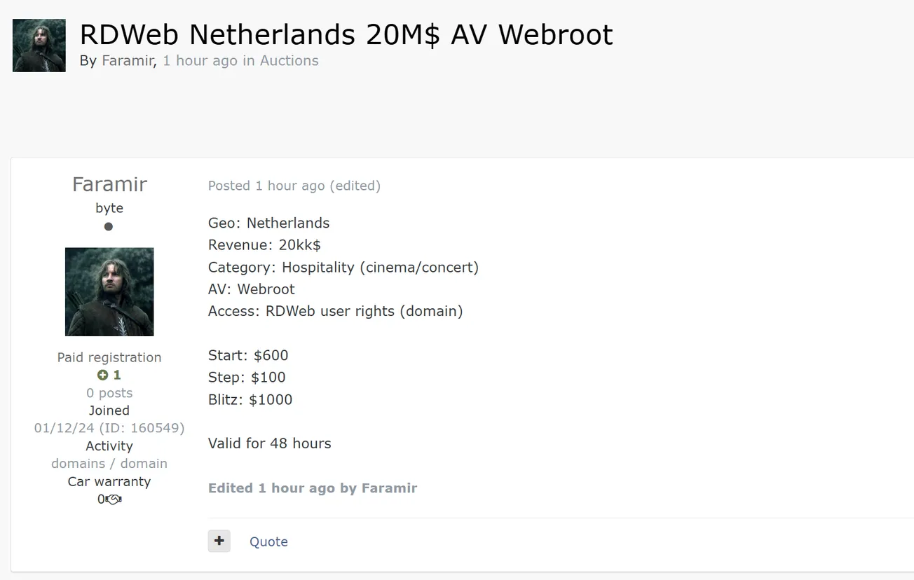 A Threat Actor is Allegedly Selling RDWeb Access of an Unidentified Shop in the Netherlands
