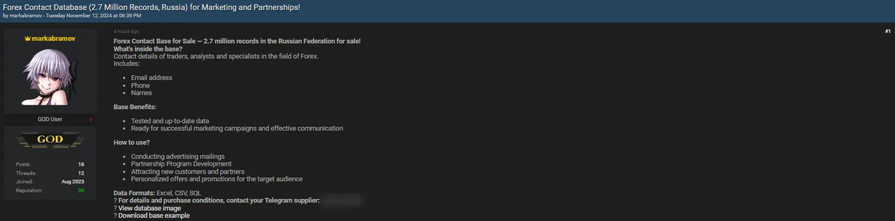 A Threat Actor is Allegedly Selling Russian Forex Contact Data