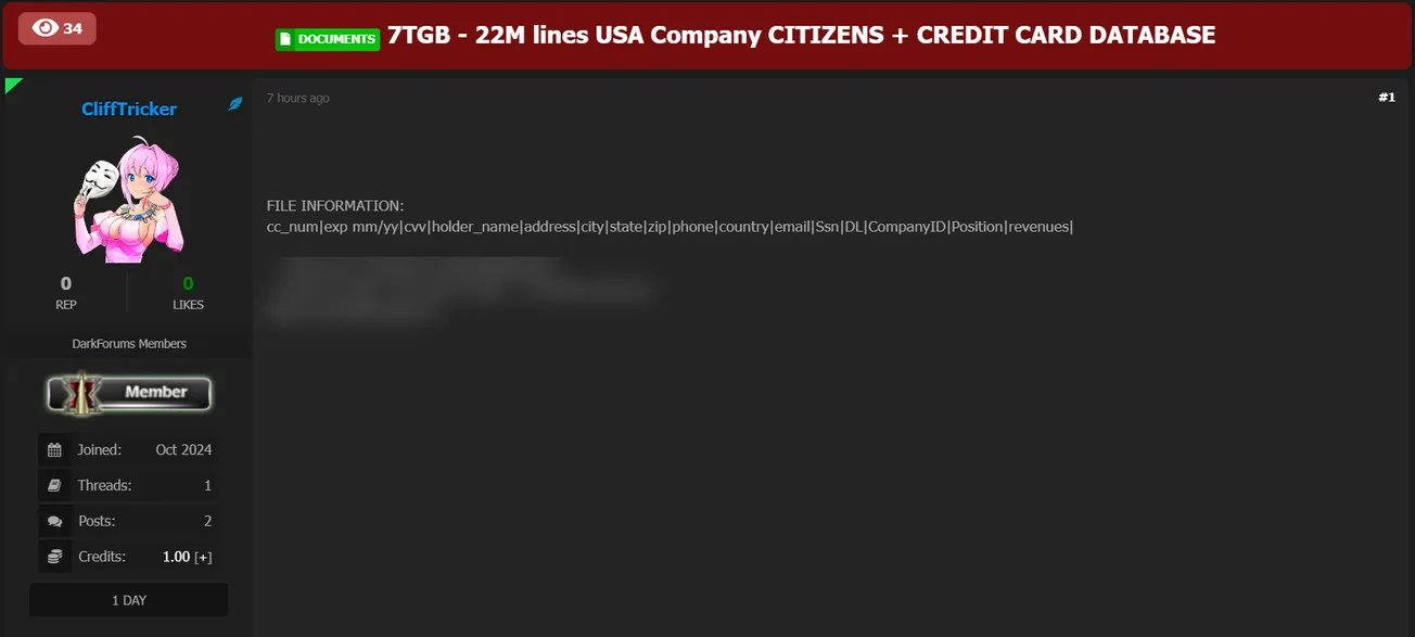 A Threat Actor is Allegedly Selling Sensitive Information of an Unidentified US Company