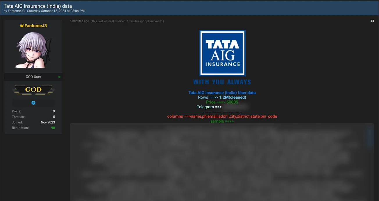 A Threat Actor is Allegedly Selling TATA AIG data