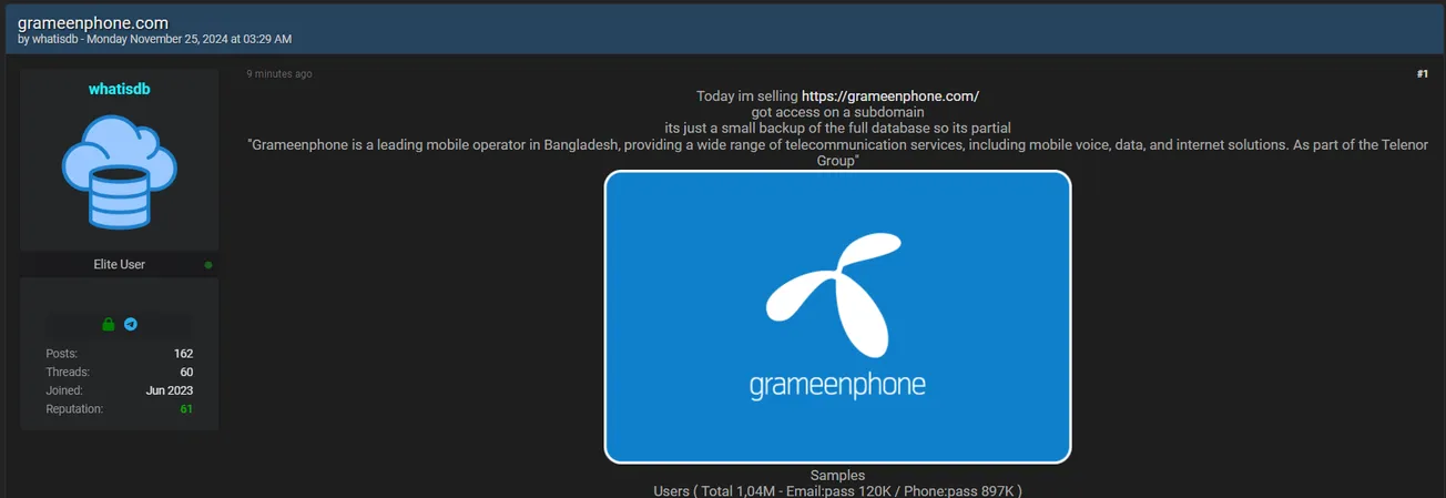 A Threat Actor is Allegedly Selling the Data of Grameenphone