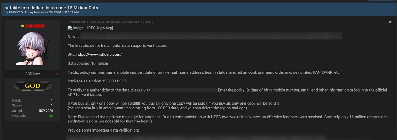 A Threat Actor is Allegedly Selling the Data of HDFC life for $150,000 USDT