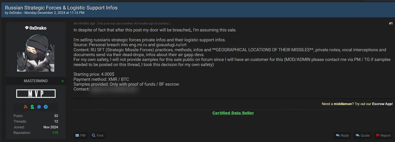 🚨 Title: Alleged data sale of Russia's Strategic Missile Forces