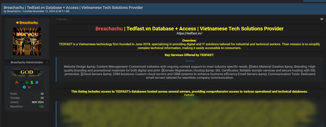 A Threat Actor is Allegedly Selling the Data of TEDFAST