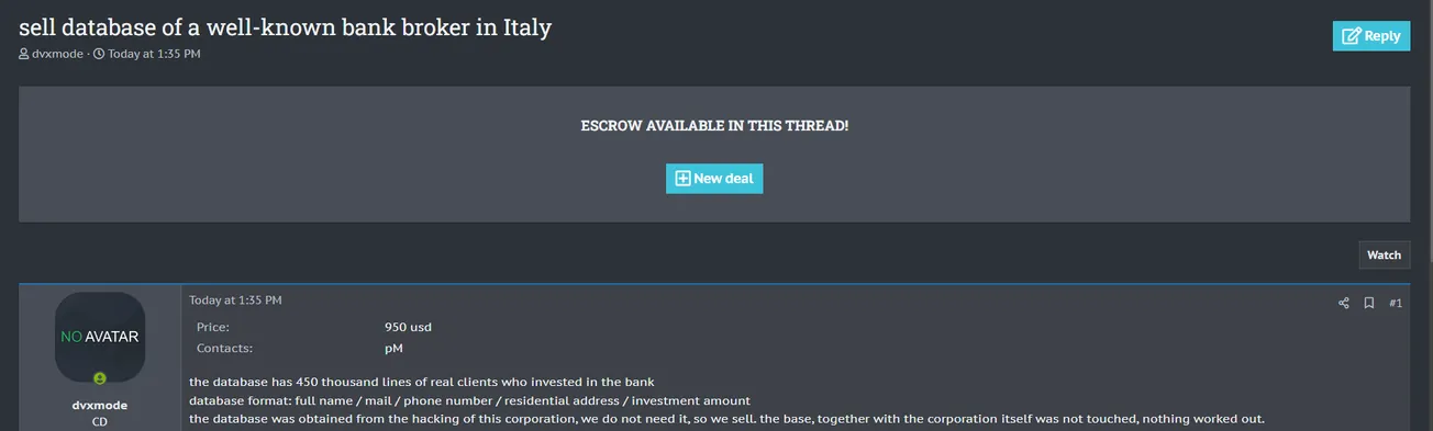 A Threat Actor is Allegedly Selling the Database of an Unidentified Bank in Italy