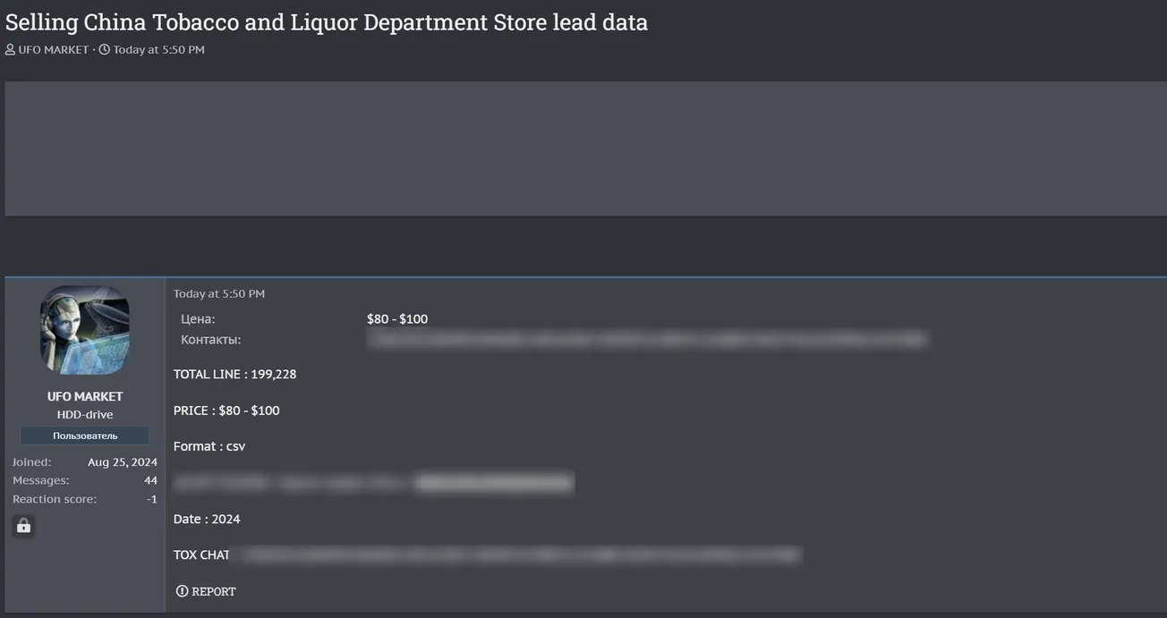 A Threat Actor is Allegedly Selling the Database of China Tobacco and Liquor Department Store