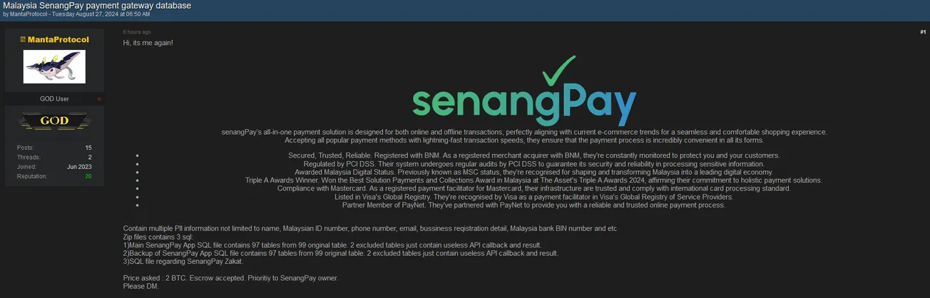 Price asked: 2 BTC. Escrow accepted. Priority to SenangPay owner.