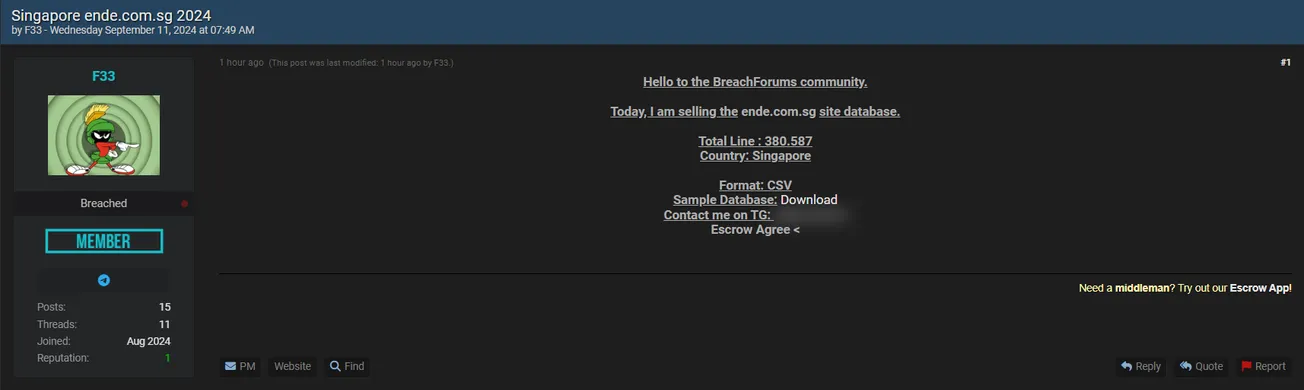 Today, I am selling the ende.com.sg site database.