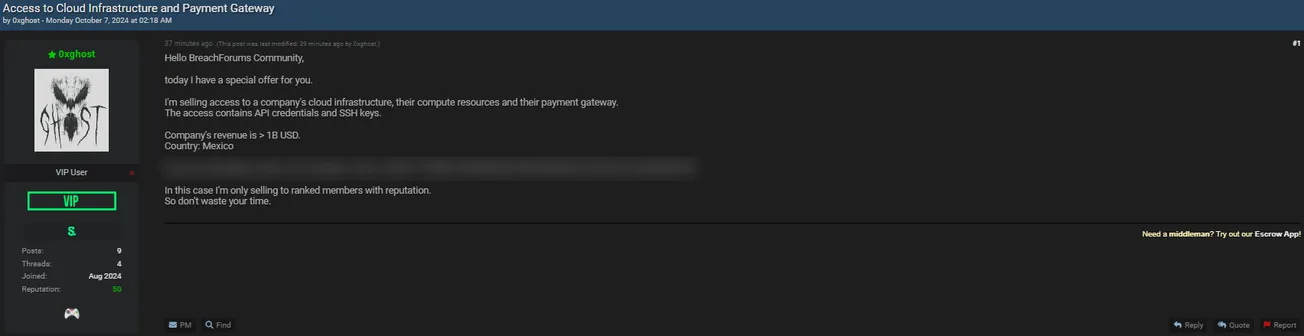 A Threat Actor is Allegedly Selling Unauthorized Access to an Unidentified Company in Mexico