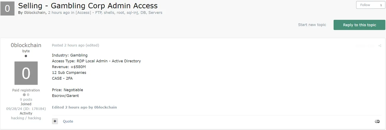 A Threat Actor is Allegedly Selling Unauthorized Access to an Unidentified Gambling Company