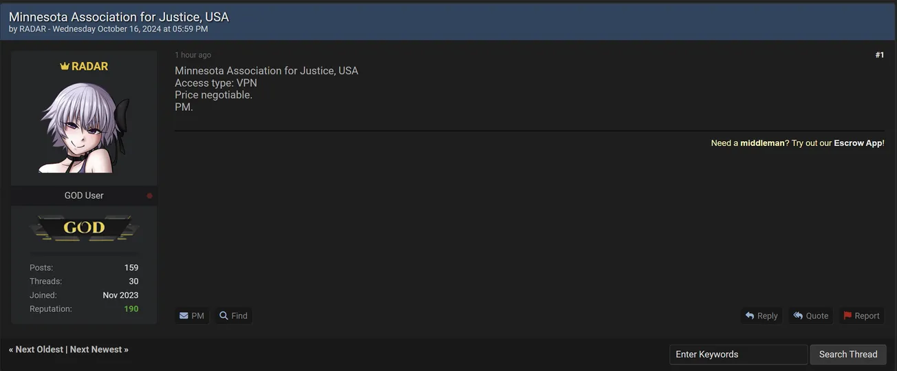 A Threat Actor is Allegedly Selling VPN Access of Minnesota Association for Justice (MAJ)