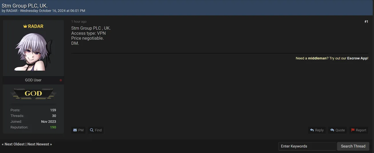 A Threat Actor is Allegedly Selling VPN Access of STM Group PLC