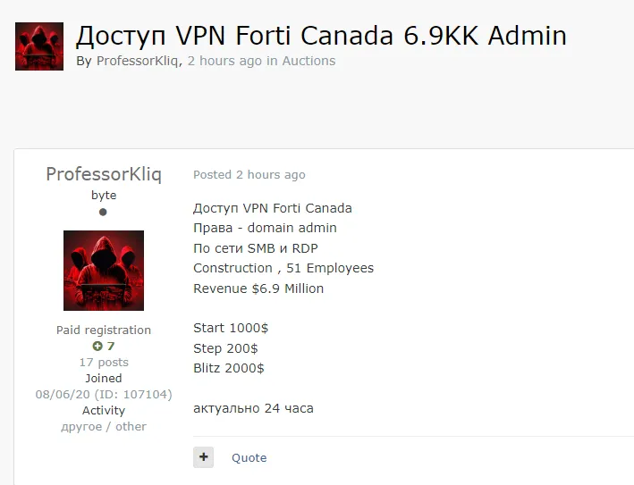 A Threat Actor is Allegedly Selling VPN Access to an Unidentified Canadian Company