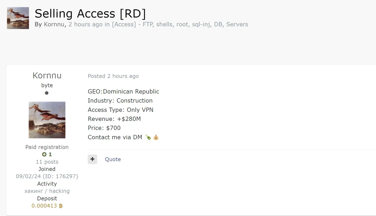 A Threat actor is Allegedly Selling VPN Access to an Unidentified Construction Company in the Dominican Republic