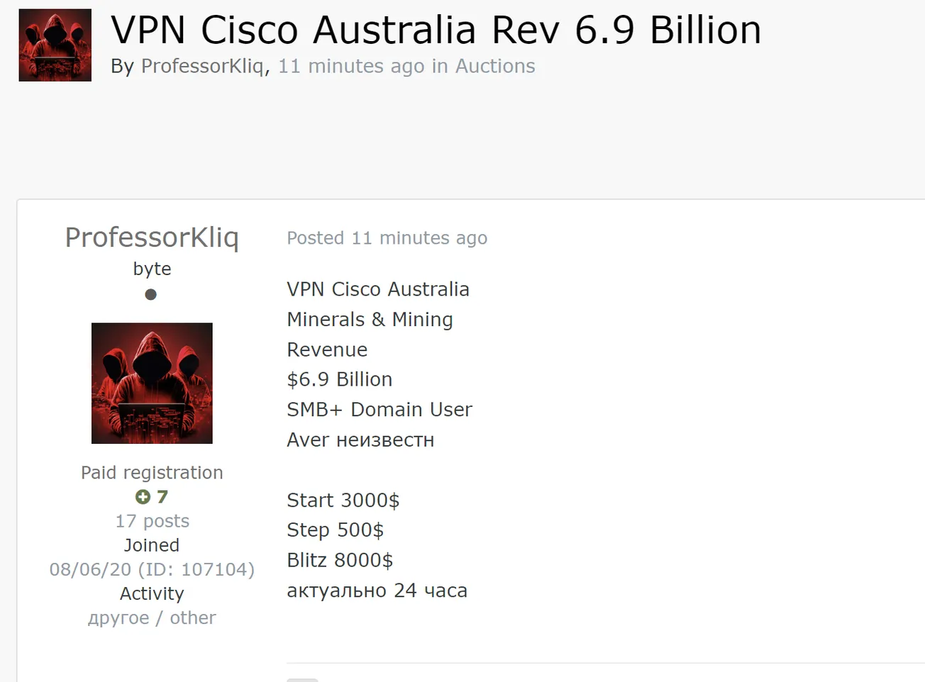 A Threat Actor is Allegedly Selling VPN Access to an Unidentified Organization in Australia with Revenue of $6.9 Billion