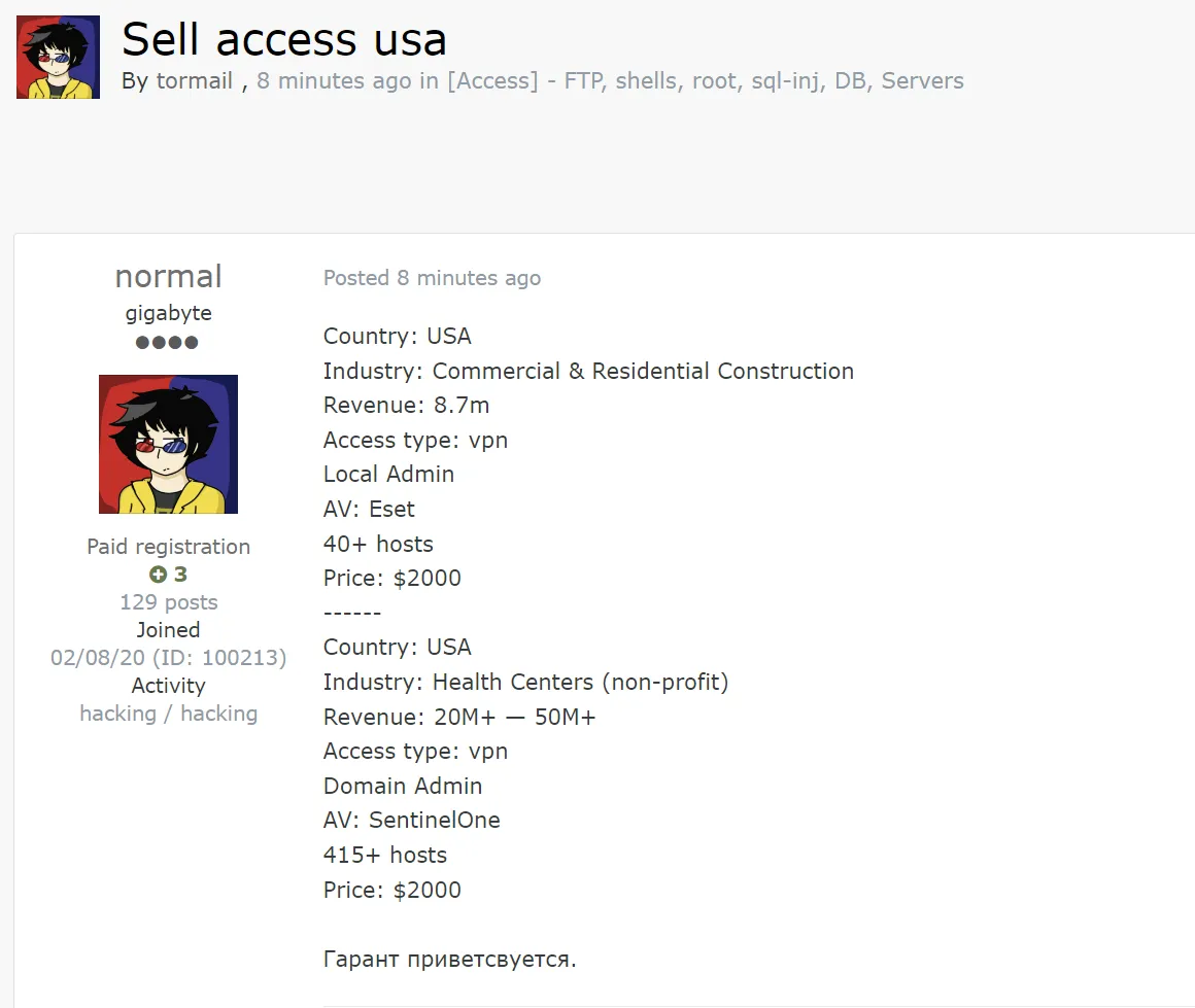 🚨 Title: Alleged VPN access sale of unidentified companies in USA