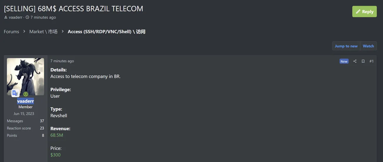 A Threat Actor is Claiming to Sell Access to an Unidentified Telecom Organization in Brazil