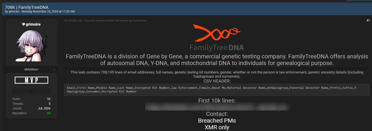 🚨 Title: Alleged data sale of FamilyTreeDNA