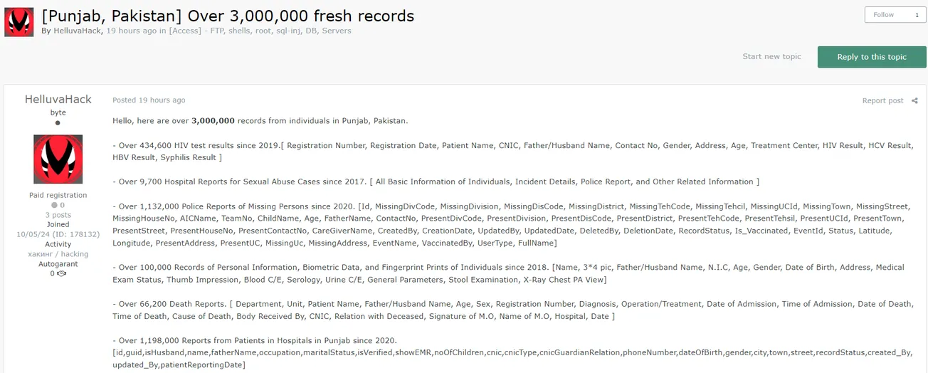 🚨 Title: Alleged data sale of over 3 million records from individuals in Punjab, Pakistan