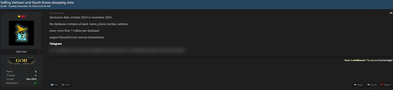 🚨 Title: Alleged sale of shopping data from Vietnam and South Korea