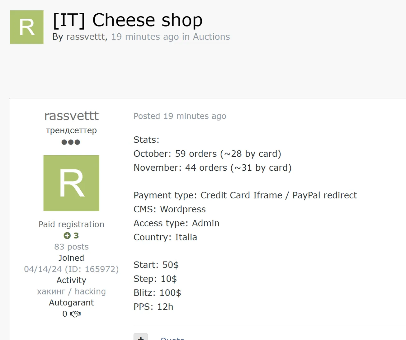 🚨 Title: Alleged WordPress admin access sale of unidentified shop in Italy