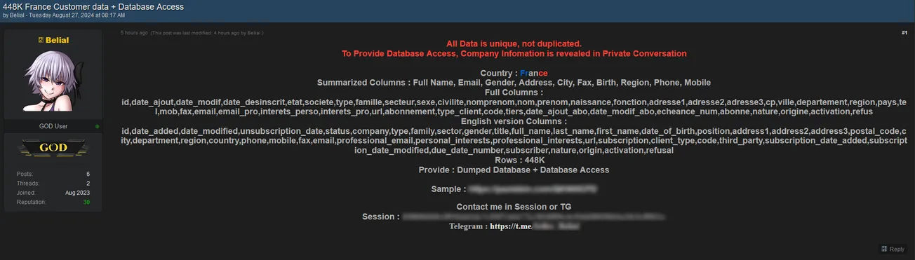 id, date_ajout, date_modif, date_desinscrit, etat, societe, type, famille, secteur, sexe, civilite, nomprenom, nom, prenom, naissance, fonction, adresse1, adresse2, adresse3, cp, ville, departement, region, pays, tel, mob, fax, email, email_pro, interets_perso, interets_pro, url, abonnement, type_client, code, tiers, date_ajout_abo, date_modif_abo, echeance_num, abonne, nature, origine, activation, refus