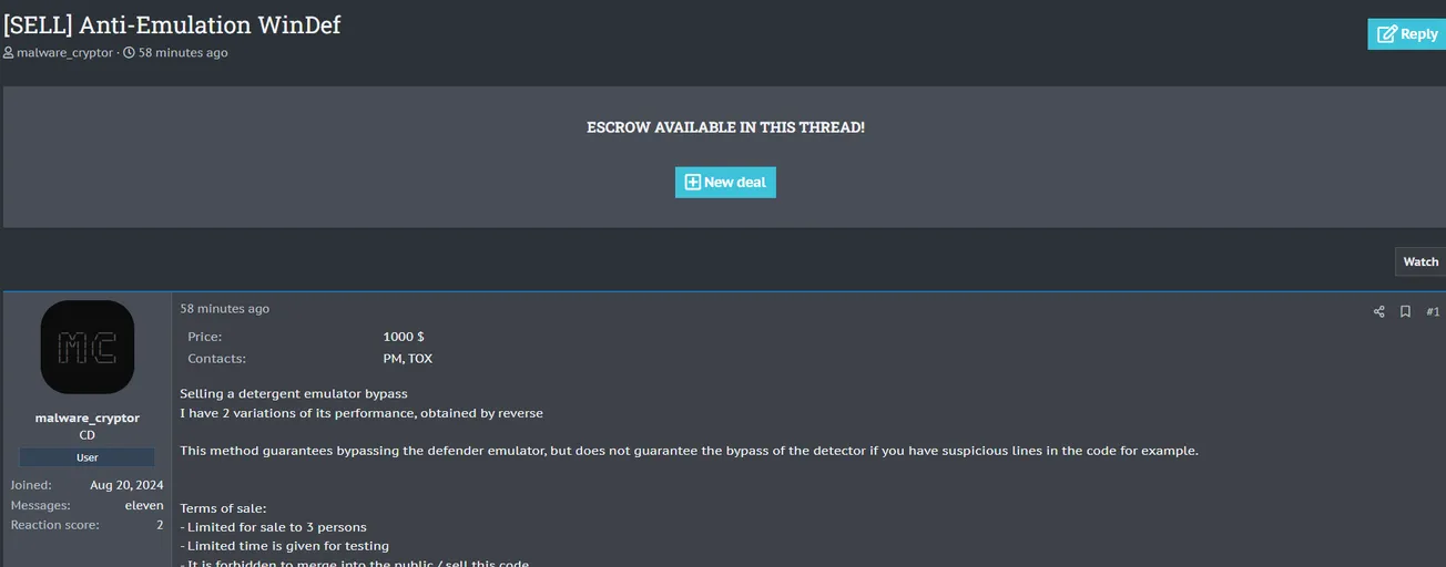 This method guarantees bypassing the Windows Defender emulator but does not guarantee bypassing the detector if suspicious lines are present in the code.