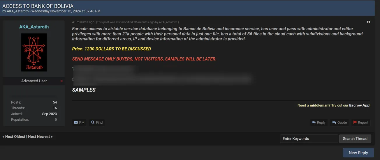 A Threat Actor is Selling Access of Banco de Bolivia