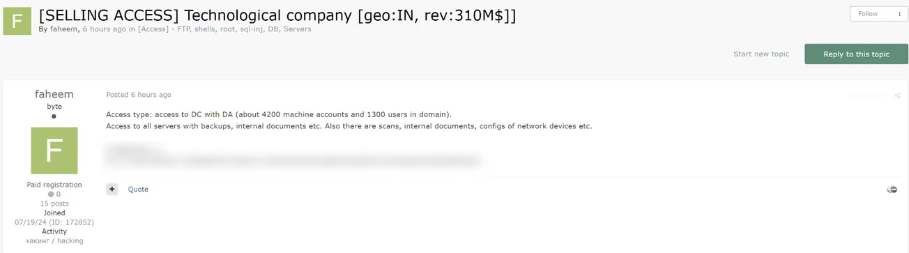 A Threat Actor is Selling Access to an Unidentified Technological Company in India