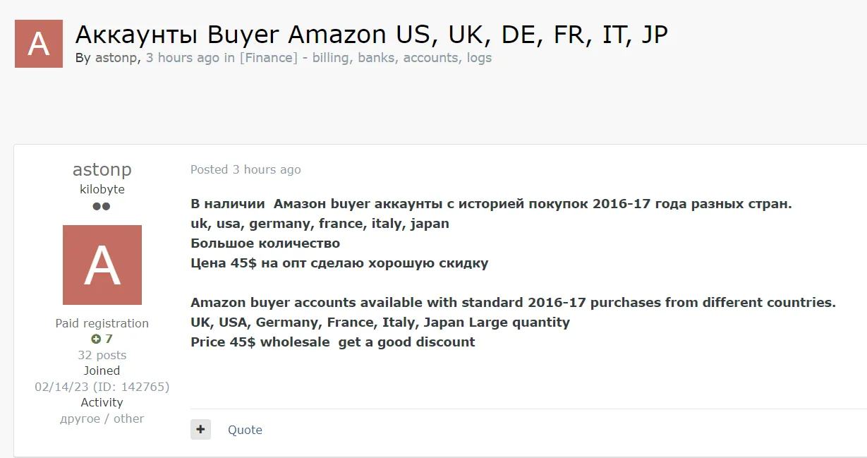 A Threat Actor is Selling Amazon Buyer Accounts Across Global Marketplaces