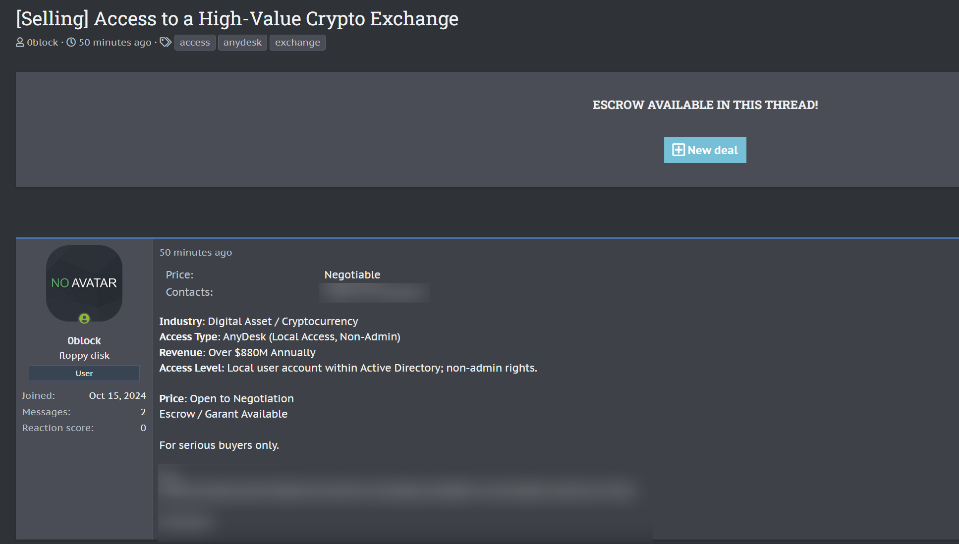 🚨 Title: Alleged AnyDesk access sale of unidentified Crypto Exchange company