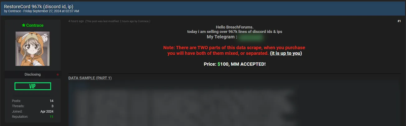 🚨 Title: Alleged sale of Discord data