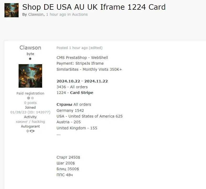 A Threat Actor Reportedly is Selling Credit Cards to an Unidentified Shop Across Multiple Countries