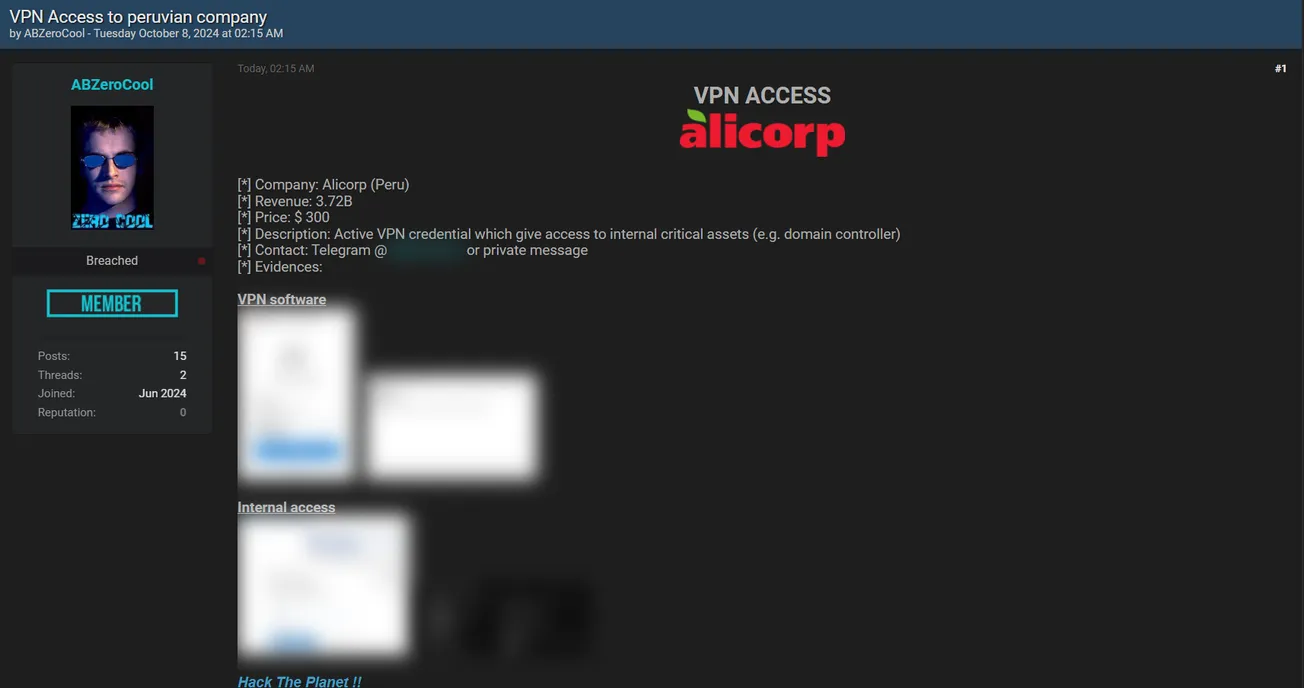 🚨 Title: Alleged sale of VPN access to Alicorp