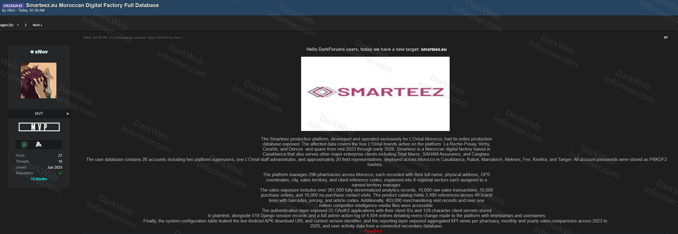 A threat actor going by xNov has leaked the complete production database of Smarteez, a Moroccan digital factory based in Casablanca that was developed and operated exclusively for L'Oreal Morocco. Smarteez also serves other major enterprise clients including Total Maroc, SAHAM Assurance, and Carglass. The exposed data covers four L'Oreal brands active on the platform: La Roche-Posay, Vichy, CeraVe, and Dercos, spanning from mid-2023 through early 2026.