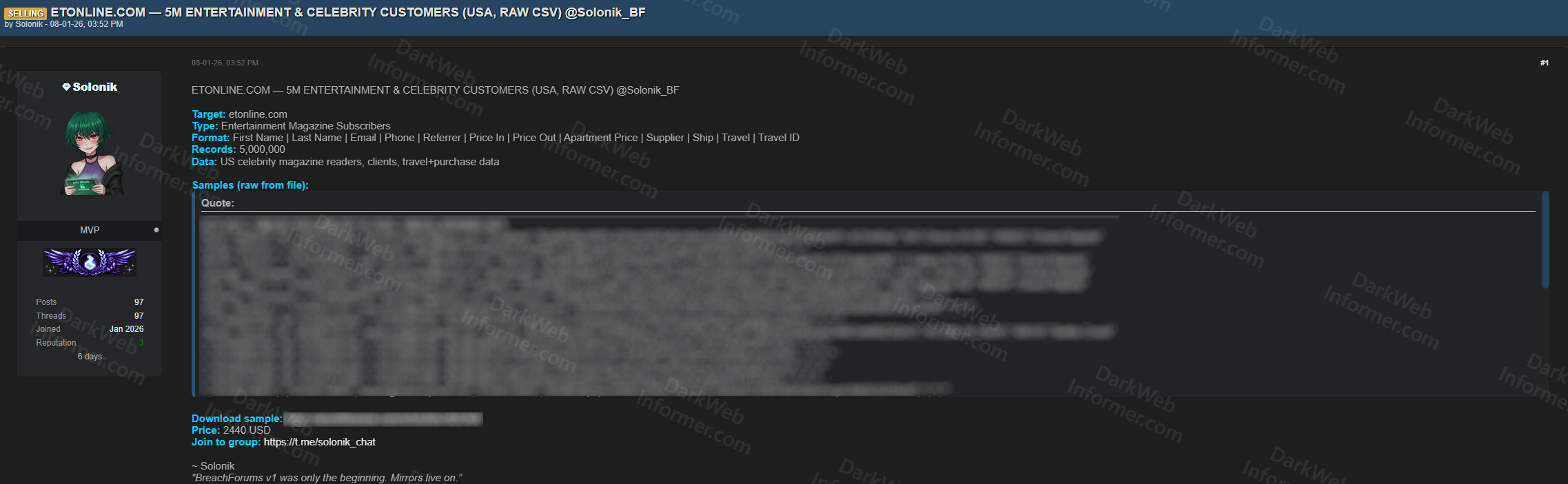 A threat actor operating under the handle "Solonik" is advertising the sale of an alleged customer database from ET Online (etonline.com), a popular entertainment and celebrity news platform. The dataset is claimed to contain approximately 5 million customer and subscriber records in raw CSV format.