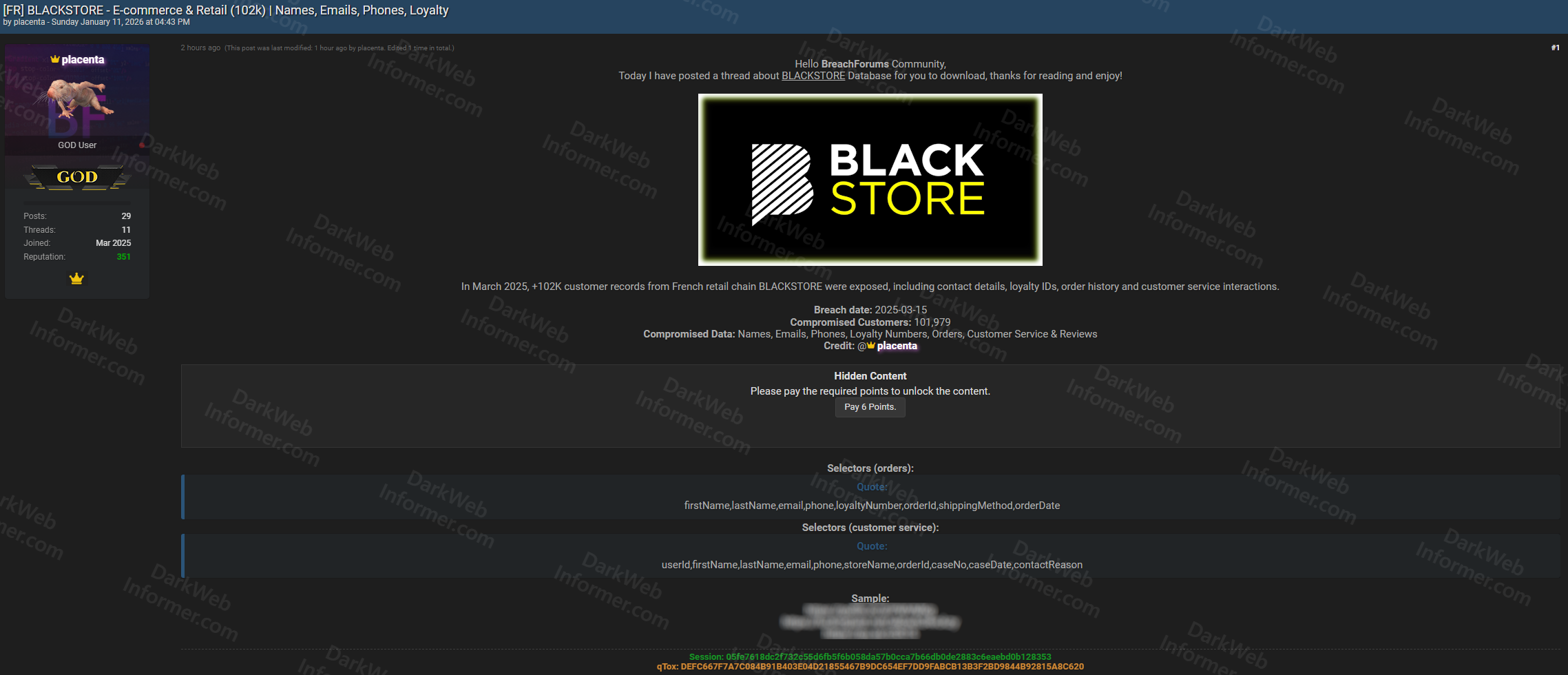 A threat actor using the handle "placenta" claims to have exposed approximately 102,000 customer records from French retail chain BLACKSTORE. The threat actor states that in March 2025, customer records from the French retail chain were exposed, including contact details, loyalty IDs, order history, and customer service interactions.
