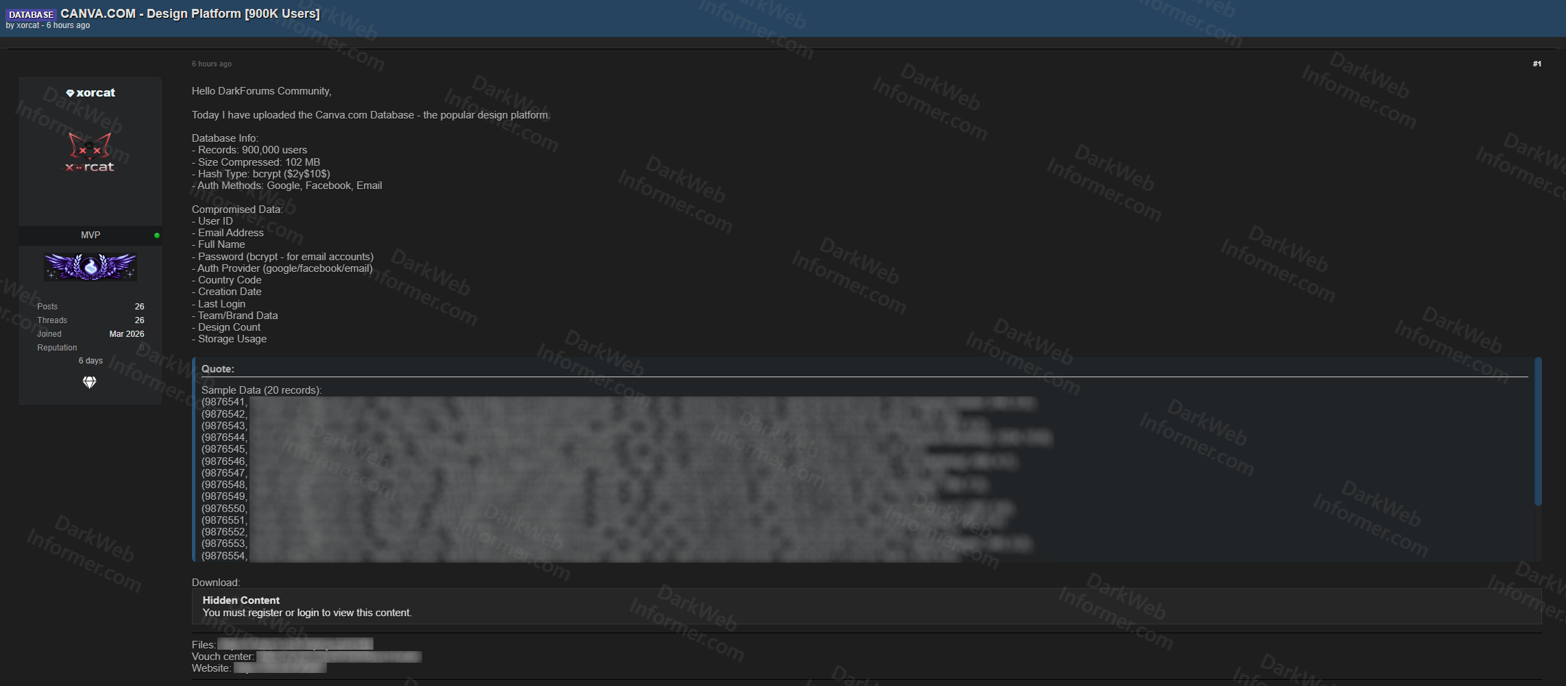 A threat actor going by xorcat has uploaded a database allegedly from Canva, the widely used Australian design platform with over 170 million monthly active users worldwide. The leaked dataset contains 900,000 user records and has been published as a free download for registered forum members. The actor provided a 20-record sample to demonstrate the data's structure and authenticity.