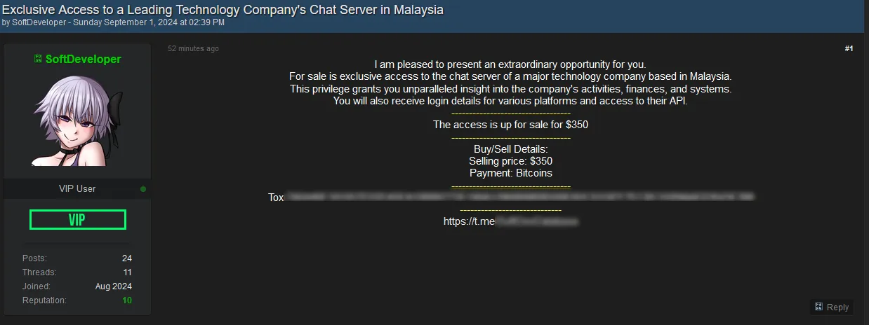 For sale is exclusive access to the chat server of a major technology company based in Malaysia.