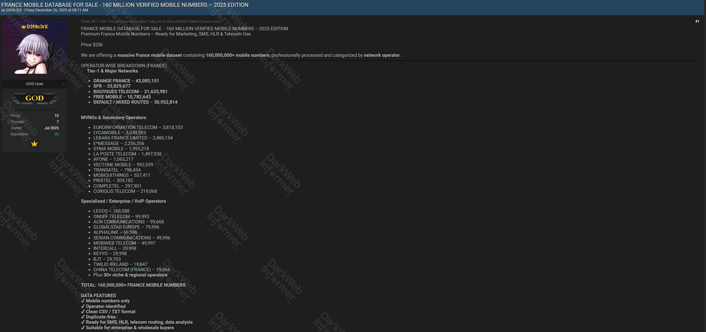 The threat actor "D3f4c3rX" is offering a massive France mobile dataset containing 160,000,000+ "verified mobile numbers, professionally processed and categorized by network operator."
