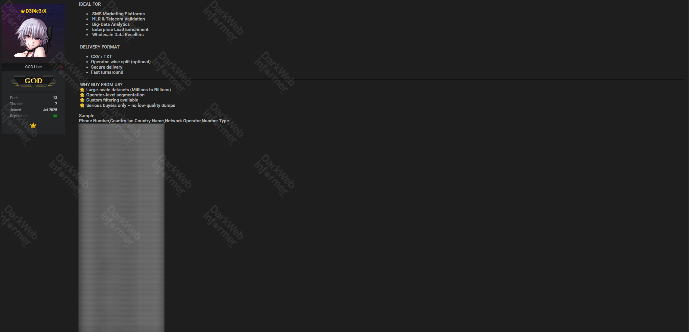 The sale of such a large database of mobile numbers raises significant privacy concerns under GDPR and could enable spam campaigns, phishing, and social engineering attacks.
