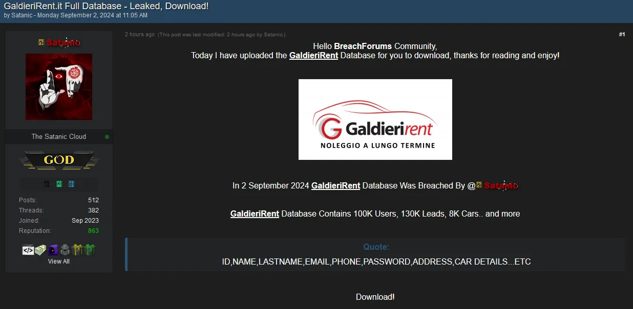 On September 2, 2024, the GaldieriRent Database was breached by @Satanic.