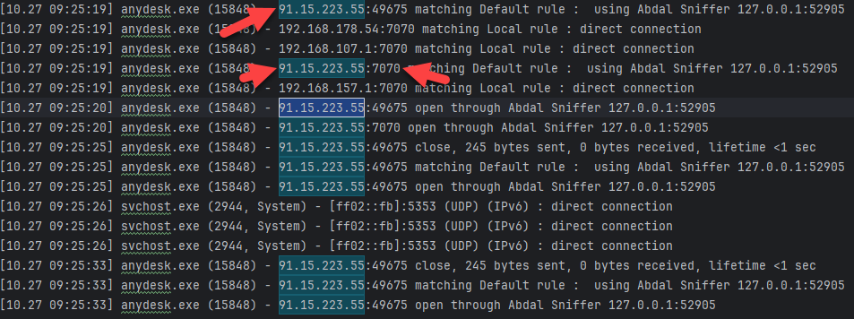 When the Allow Direct Connections option is enabled on the attacker’s system, AnyDesk inadvertently exposes the target’s public IP address in network traffic. This IP address can be easily identified through network sniffing on the attacker’s system. If both systems are on the same local network, the target’s private IP address may also be accessible. The image below demonstrates the network traffic capture using the Abdal Sniffer tool, highlighting how this information is exposed.